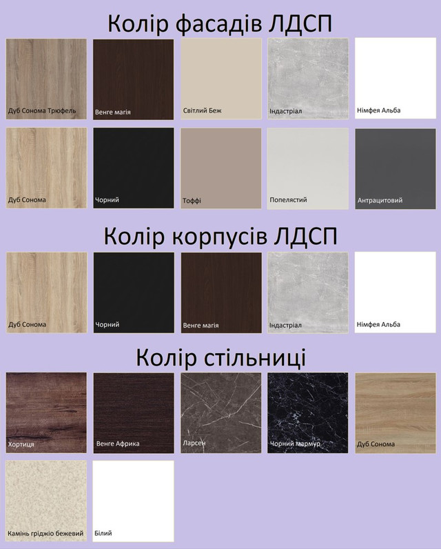 - Стільниця роздільна (товщина 28 мм), шафи можна міняти місцями